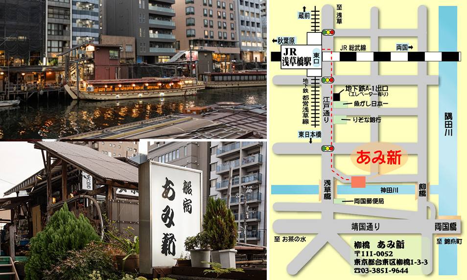 | 屋形船 | 柳橋「あみ新」 屋形船(JR浅草橋駅東口から徒歩3分) 〒111-0052 東京都台東区柳橋1-3-3 (電話)03-3851-9644 |