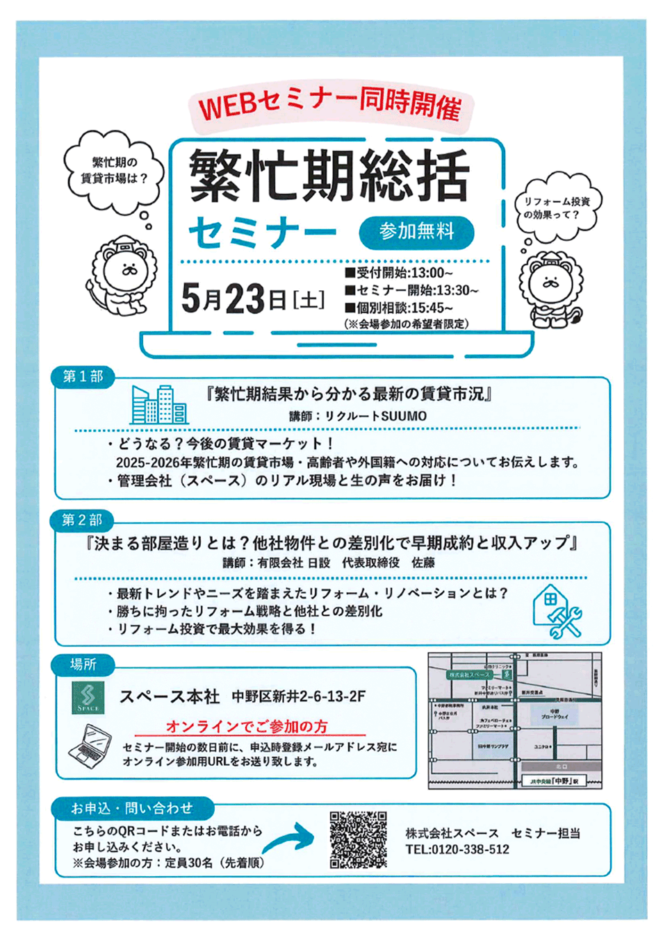 中野区支部会員企業である株式会社スペース様から、不動産賃貸事業に関するオーナー様向け繁忙期総括セミナーのご案内です。